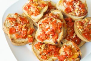 Bruschetta é um antepasto italiano feito à base de pão, tostado em grelha com azeite. Há diversas variações, sendo a mais famosa, a bruschetta de tomate, que leva, por cima da fatia de pão, tomates e manjericão. Simples de fazer e super apetitosa, é uma entrada perfeita para o jantar ou happy hour.