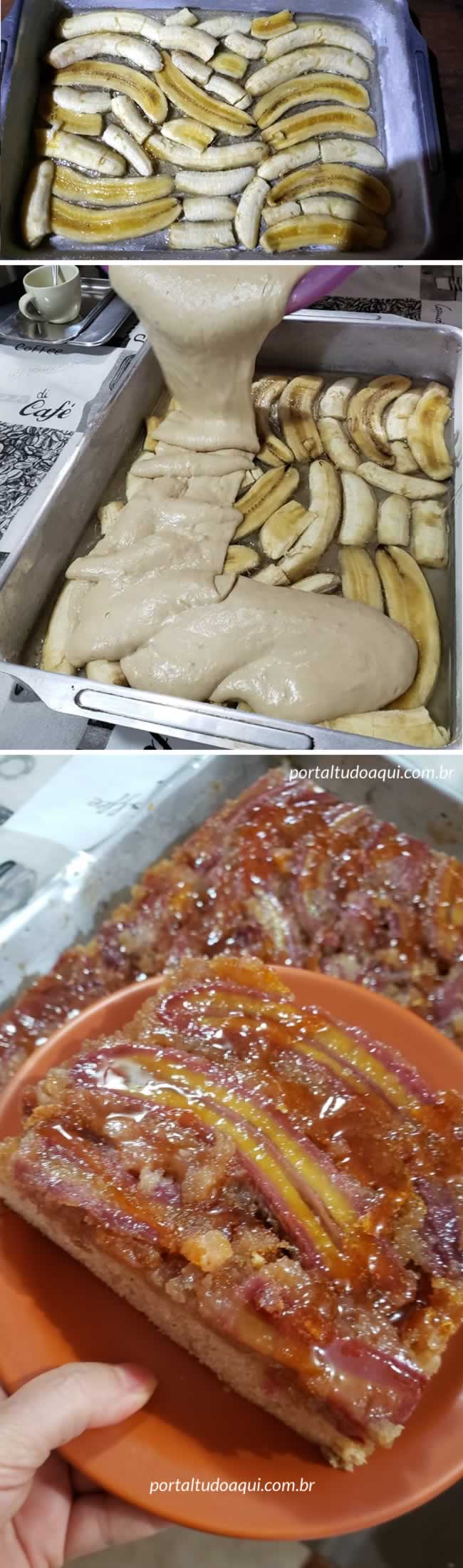 Despeje a massa na assadeira untada com bananas caramelizadas. Leve ao forno pré-aquecido e deixe assar por 40 minutos. Depois que o bolo assar, e esfriar deixe-o na geladeira por uma hora antes de desenformar.
