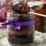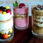 Na hora de preparar, de montar o seu bolo, faça os pedaços redondos no tamanho do seu pote é claro e vá montando as camadas começando pela base de massa de bolo, depois calda, recheios até terminar com a cobertura e enfeites. Uma boa opção na hora de variar é fazer bolo branco e bolo de chocolate para dar contraste e deixar mais bonito. Ou colocar 3 recheios diferentes, usar frutas se for para consumir no mesmo dia, mas vai do gosto do freguês, então se for por encomenda, pergunte qual é o que ele mais prefere.