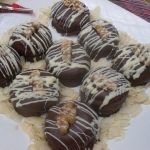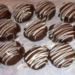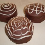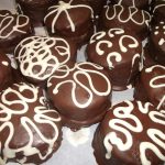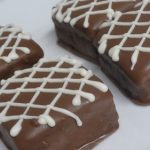 Enquanto o chocolate não solidifica, faça uns riscos com chocolate para cobertura branco derretido.