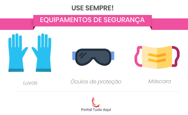 Antes de tudo, separe os materiais de proteção como luvas, máscara e óculos para evitar qualquer acidente no manuseio dos ingredientes.